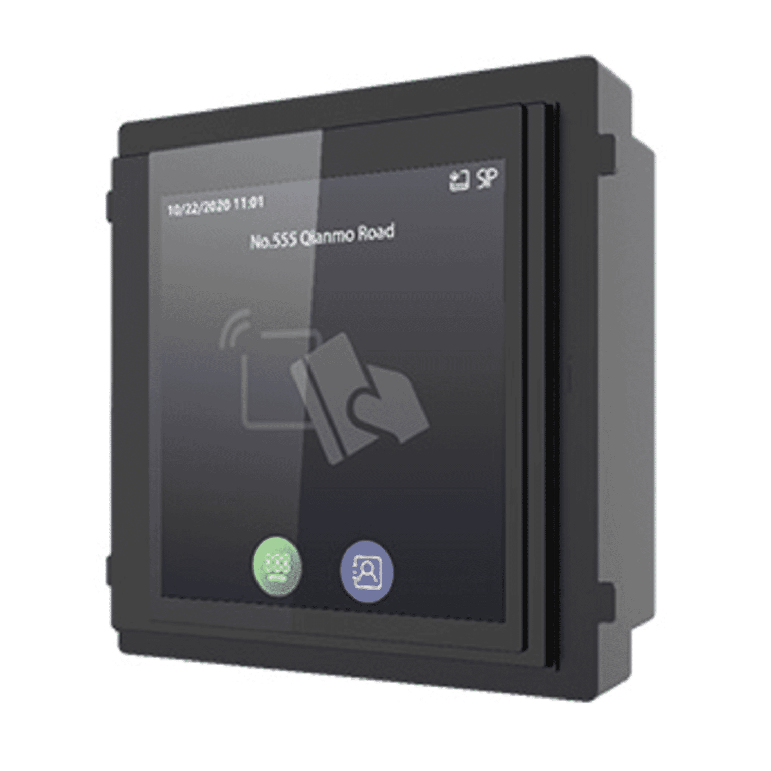 The Hikvision DS-KD-TDM is a modular 4.0" IPS capacitive touch-display extension designed for the Hikvision KD-series door stations. Combining a crisp square IPS touchscreen with an integrated MIFARE (13.56 MHz) card reader and PIN entry, the DS-KD-TDM upgrades visitor interaction and access control without replacing an entire door station. It’s intended for outdoor use and engineered with weather and vandal resistance, making it a practical addition to residential, multi-tenant and light-commercial entry systems.