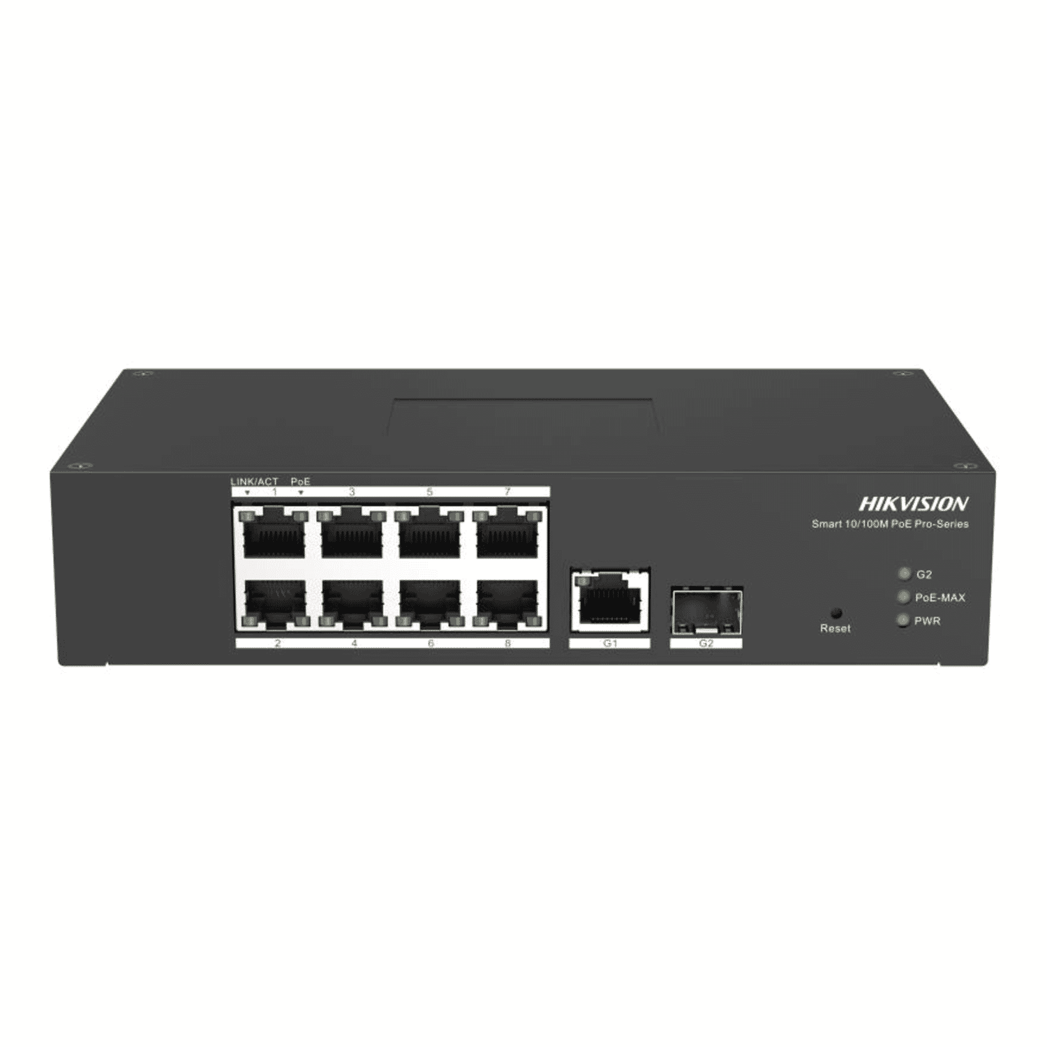 - 8 × 10/100 Mbps PoE RJ45 ports (ports 1–8)– Each port supports IEEE 802.3af/at standards and can deliver up to 30 W to power modern cameras, access points or other PoE devices.